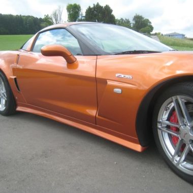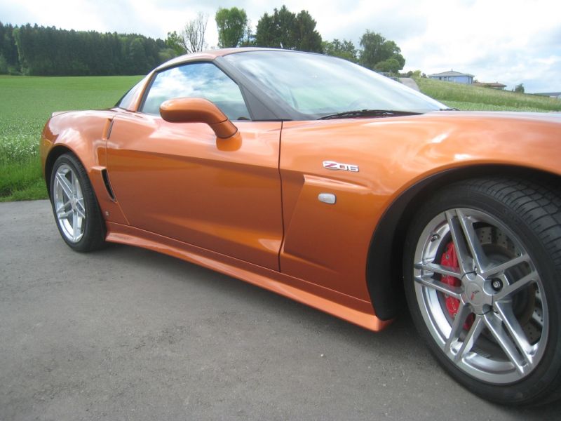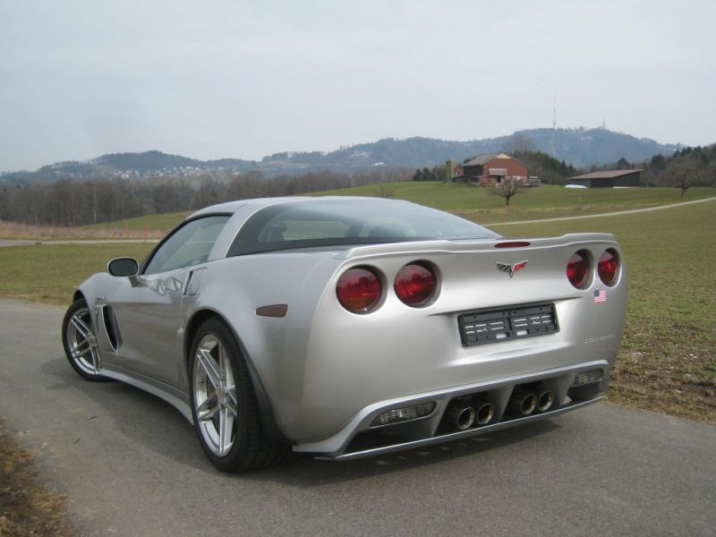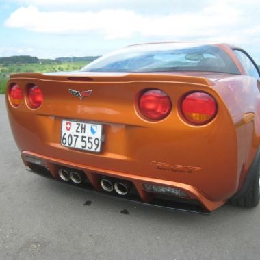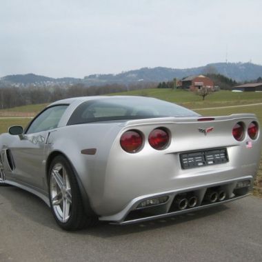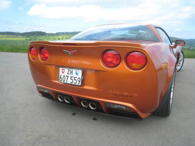 Um der C6/Z06 optisch etwas Schwung zu geben, haben Umbauteile wie Frontspoiler, Seitenschweller und Heckdiffusor selbst hergestellt und angepasst. Der Heckdiffusor mit Mittelteil und unterem Spoiler ist in sichtbarer echter Kohlefaser oder in Wagenfarbe lackiert erhältlich.